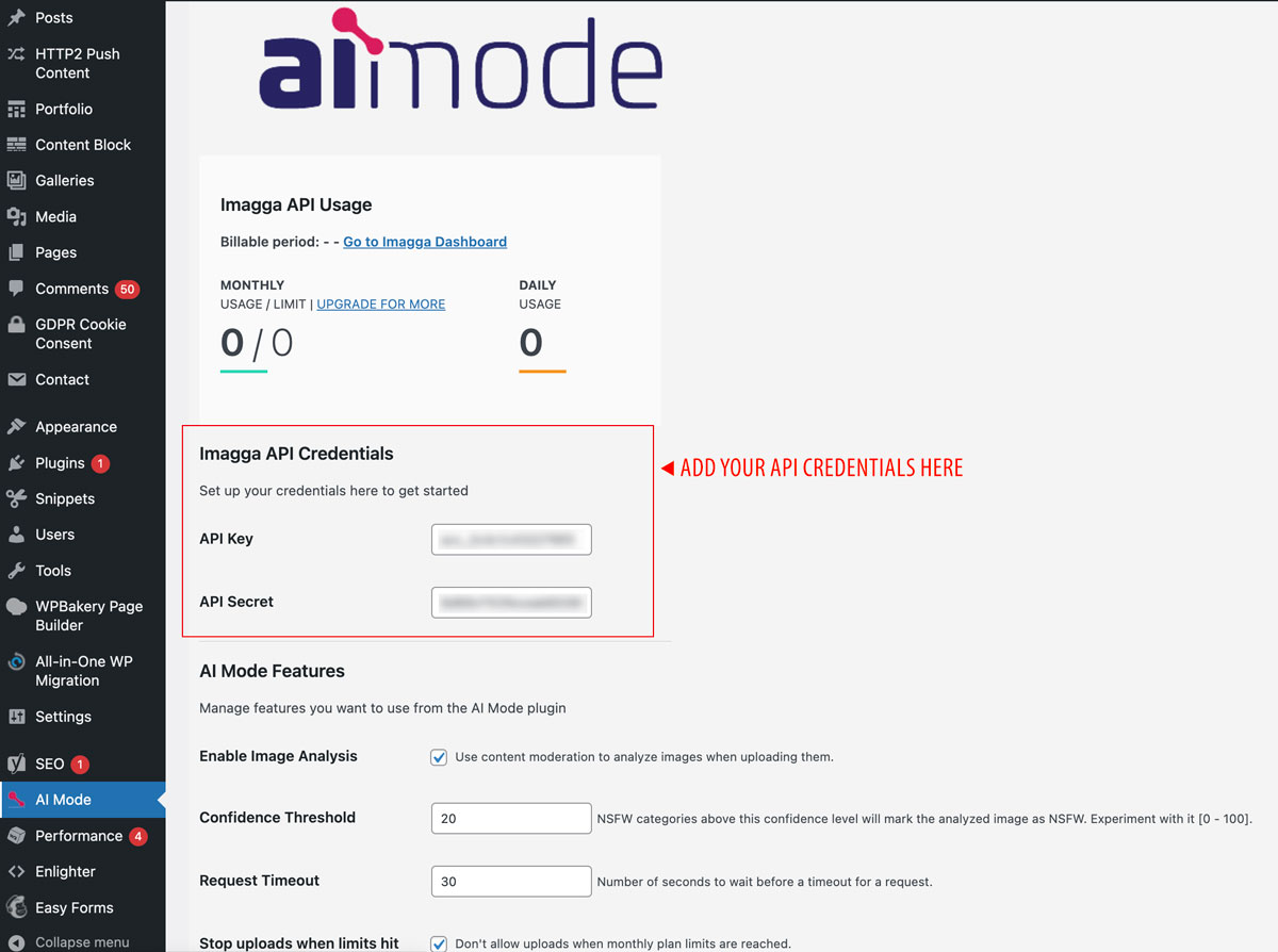 - Go to the plugin settings in the sidebar navigation under AI Mode and enter your API key and Secret to connect with Imagga’s content moderation API. You can get free API credentials by creating an account here. Additionally, you can manage some recognition features, such as the Confidence threshold.
